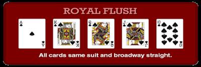 Royal Flush (berurutan sampai As dan semua motif kartu sama) Royal Flush adalah kartu Straight Flush dengan nilai yang lebih tinggi, contohnya lawan memiliki 5 6 7 8 9 keriting dan kita memiliki 10 J Q K As HATI